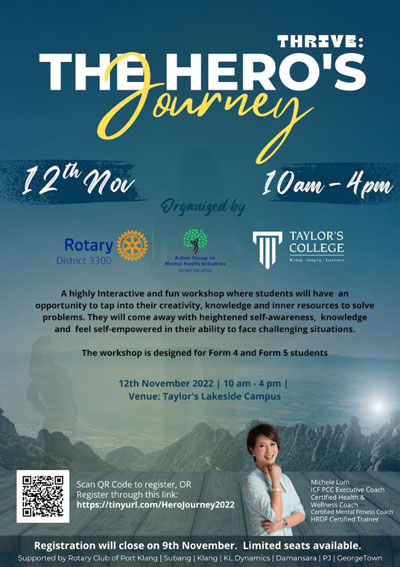 Thanks to our coach, Michele Lum, along with the co-facilitators,  for a brilliant facilitation, presenting mental health info in a way that is relevant and meaningful for the student audience.  A one day event, THRIVE: THE HERO’S JOURNEY is a highly interactive and fun workshop, designed for Form 4 and Form 5 students. The workshop provided these students with a safe space to speak up and to tap into their creativity, knowledge and inner resources to solve problems.  They came away with heightened self-awareness, knowledge, and feel self-empowered in their ability to face challenging situations.